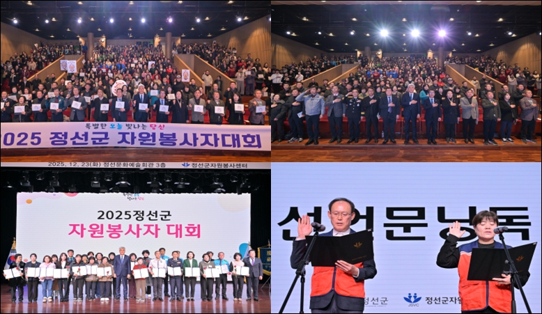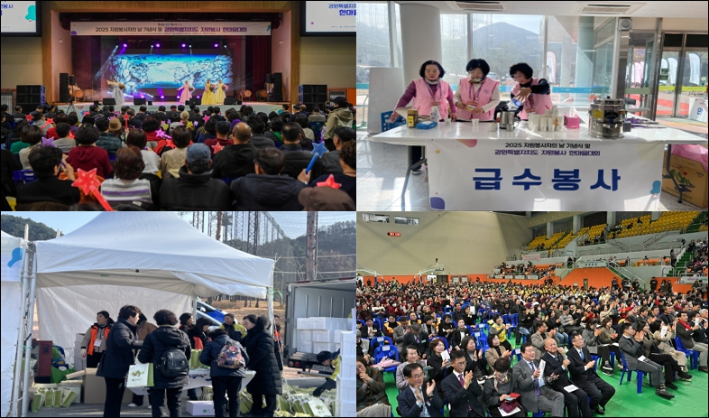 강원특별자치도가 주최한 「강원특별자치도 자원봉사자대회 및 한마음대회」를 12월2일 정선군종합경기장에서 개최하였습니다! 이번 대회에는 김진태 강원특별자치도지사를 비롯, 최승준 정선군수, 박광구 강원특별자치도자원봉사센터 이사장, 송근직 강원특별자치도자원봉사센터장, 장기봉 정선군자원봉사센터소장 등 기관단체장과 자원봉사자 등 2,000여명의 인원이 참석해 주셨습니다! 도내 각 시·군 자원봉사자들이 한자리에 모여 한 해 동안 지역사회 곳곳에서 펼쳐온 나눔과 봉사활동의 의미를 되새기고, 자원봉사자 간 소통과 화합을 다지는 시간을 가졌습니다! 행사는 정선아리랑문화재단의 ‘뗏꾼’ 공연을 시작으로 자원봉사 활동 영상 상영과 기념식 · 유공 자원봉사자 시상, 축하공연 및 화합 프로그램 등으로 진행됐으며, 특히 정선군 자원봉사자들의 적극적인 참여로 지역 봉사 역량과 연대의 가치를 널리 알리는 좋은 기회가 되었습니다!