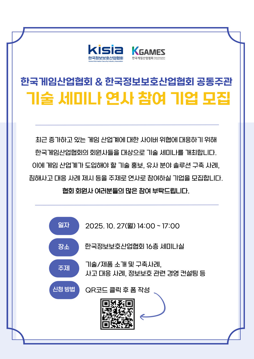 [한국게임산업협회 & 한국정보보호산업협회 공동주관 기술 세미나 연사 참여 기업 모집]
