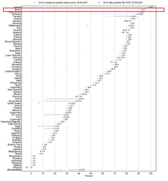 < 2018→2021년간 국가별 유효탄소가격이 적용되는 비중 변화 >
