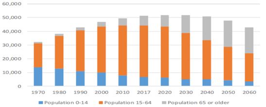 <연령별 한국의 인구구조 변화 예상(1970∼2060)>
