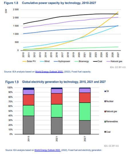 IEA는 재생에너지 2022 보고서를 통해 2027년까지 재생에너지 전망을 발표하였다. 올해 보고서를 통해 IEA는 2022~2027년 기간 동안 재생에너지 설비 용량이 지난 20년간(2001~2021) 증가한 전체 재생에너지 설비 규모에 해당하는 약 2,400GW 증가할 것으로 예측하였다. 특히, 태양광 발전 설비 용량이 2024년에는 수력, 2026년에는 천연가스, 2027년에는 석탄발전 설비 용량을 넘어설 것으로 전망하였고 풍력발전 설비 용량 역시 현재 대비 2배 이상 증가할 것으로 예측하였다. 이러한 재생에너지 설비 증가는 주로 중국, 유럽, 미국, 인도 등에 의해 주도될 것으로 분석하였다. IEA는 전력 생산 측면에서도 재생에너지를 통한 전력 생산이 2022~2027년 동안 현재보다 약 60% 증가하여 2025년 초에는 석탄발전을 넘어서 최대 발전원으로 성장할 것으로 예측하였다. 특히, 재생에너지 중 태양광과 풍력을 통한 전력 생산 비중이 2022~2027년 동안 2배 이상 증가하여, 2027년에는 전체 전력 생산량의 20% 수준에 도달할 것으로 전망하였다.