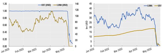< 알고리즘 스테이블코인 UST-LUNA 가격 및 시가총액 변화 >