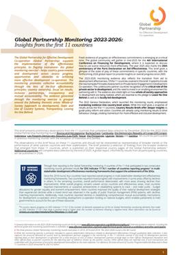 효과적 개발협력을 위한 파트너십(GPEDC) 공동사무국(OECD, UNDP)은 2023–2026 모니터링 라운드에 참여 중인 59개국 중 2024년까지 데이터 수집을 완료한 11개국의 초기 관찰 내용을 분석한 정책브리프를 게시했다. 동 국가들 중 이전 모니터링에 불참한 2개국을 제외한 9개국의 SDGs 17.16.1.(다자 이해관계자 파트너십) 지표를 비교한 결과, 4개국은 전반적으로 진전, 2개국은 혼합, 3개국은 악화된 것으로 확인되었다. 동 브리프는 11개국에서 도출된 결과 중 일부를 선별하여 4대 주제(전 사회적 접근, 국가시스템, 투명성, 소외계층 포용)별로 제시하고 있으며, 향후 전체 모니터링 참가국(59개국)의 데이터 수집을 2025년까지 마친 후, 글로벌 종합보고서를 2026년에 발간될 예정이다...