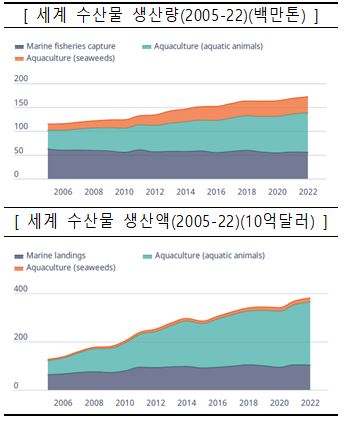 세계 수산물 총생산은 증가 추세로 양식업이 그 성장을 주도하고 있다. 2022년 수산물 생산량은 172백만톤으로 지난 15년간 연평균 2% 증가 중이며, 총생산액은 3,810억달러로 연평균 7% 증가 중이다. 한국은 총생산량 기준 세계 12위, 총생산액 기준 세계 8위 수준이다. OECD는 수산업이 직면한 주요 과제를 자원의 지속가능성 개선과 기후변화 대응으로 지적하며, 이를 위해 어족 자원의 건강성을 높이는 어업 관리를 도입하고, 수산업에 대한 정부 지원을 개선할 것을 권고하고 있다. 특히, 기후변화에 대응한 어업 관리 체계를 구축할 수 있도록 ➀건강하고 회복력 있는 어족 자원 유지, ➁생태계 기반 어업 관리 도입, ➂각 기관 간 유연하고 협력적이며 시의성 있는 네트워크 구축 및 ➃정밀한 취약성 평가에 바탕을 둔 대응 우선순위 선정을 강조하였다. 또한, 지속가능한 어업을 위한 수산업 지원 정책 개선 방안으로 ➀어업 모니터링, 통제 및 감시 체계 투자 확대, ➁어업 비용을 직접적으로 낮추는 지원 축소·폐지, ➂조건부 지원 및 지원 대상 명확화, ➃수혜자의 어업 활동 및 어업의 지속 가능성과 관련된 데이터 확보를 권고하고 있다.