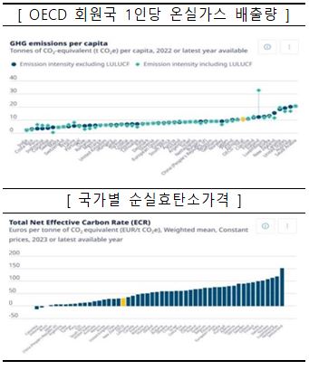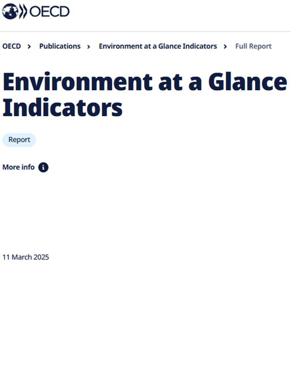 OECD는 전세계 환경현황과 각국의 환경정책을 제시하기 위해 “한눈에 보는 환경” 보고서를 발간하고 있으며, 주요 지표는 “한눈에 보는 환경지표” 플랫폼을 통해 온라인으로 공개하고 있다. 이번 보고서는 2023년 이후 통계자료를 바탕으로 2025년 3월 발표되었다. 이번 환경지표에 따르면, OECD 국가의 온실가스 배출량은 2020년 코로나19로 7% 감소 후 4% 반등 후 다시 감소하는 추세이며, 2019~2013년은 12% 이상 인구가 폭염에 노출되었다. 대부분의 OECD 국가에서 대기오염물질 배출량 수준과 강도는 2000년 이후 꾸준히 감소 중이며, 물 스트레스 수준도 지속 감소하는 것으로 나타났다. 생활폐기물은 2000년까지 증가하였다가 점차 감소 중이며, 물질 재활용, 퇴비화, 에너지회수 등 재활용이 증가하는 추세이다. 우리나라의 경우, 실효탄소가격 실질화, 초미세먼지 노출저감, 전자제품‧플라스틱 폐기물 순환성 제고, 생물다양성 보호지역 확대 등 다양한 정책과제를 식별할 수 있었으며, 관련 정책에 참고하여 향후 OECD 환경성과평가(2028) 등에 대비할 필요가 있다.