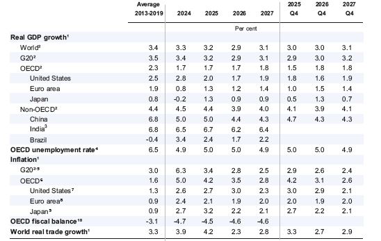 OECD는 12.2일 경제전망(Economic Outlook) 보고서를 발표하고 세계경제 성장률을 2025년 3.2%, 2026년 2.9%로 전망하였다. OECD는 세계경제가 올해 예상보다 견조한 성장을 보였으며, 높아진 무역 장벽과 정책 불확실성에도 불구하고 생산과 무역의 선제 대응(front-loading), AI 관련 투자 확대, 적극적 재정・통화정책 덕분에 경제활동을 유지했다고 평가하였다. 다만, 무역정책 관련 추가적 변화는 성장에 심각한 영향을 줄 수 있고, 인플레이션 압력이 다시 증가할 수 있으며, 금융시장 리스크가 커지고 있는 점 등을 리스크 요인으로 지적하였다. 한국경제 성장률은 2025년 1.0%로 약화되었으나, 2026년 2.1%로 회복될 것으로 전망하였다. 완화적 재정과 통화정책이 소비를 지원하고 있으며, 수출이 성장을 지탱하고 있으나 중기적으로 둔화가 예상된다고 평가하였다. 향후 관세 협상 관련 불확실성과 글로벌 공급망의 구조적 변화는 수출과 기업 투자에 부담을 줄 수 있다고 평가하였다. 부진한 내수를 감안할 때 추가적인 통화정책 완화가 예상되고, 고령화에 따른 미래 지출 수요를 감안해 재정의 지속가능한 운영이 필요하며, 규제 혁신을 통한 생산성 제고와 노동시장 개혁이 필요하다고 보았다.