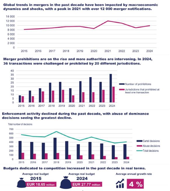 OECD는 2025.12월 「10년간의 경쟁법 집행 데이터와 집행 동향」 보고서를 발표하였다. 본 보고서는 OECD가 수집한 66개 관할권의 CompStats 데이터를 분석하여 지난 10년간(2015~2024)의 경쟁법 집행 활동과 제도 변화를 분석한 것이다. 본 보고서는 기업결합 심사, 반독점 집행, 시장조사 활동, 경쟁당국의 자원과 조직 구조 등 주요 경쟁정책 영역의 통계적 추세를 제시한다. 지난 10년 동안 많은 국가에서 기업결합 신고 건수는 전반적으로 증가하였으며, 디지털 경제 확산에 따라 플랫폼 기업과 데이터 관련 경쟁 이슈가 중요하게 부각되었다. 경쟁당국은 특히 새로운 경쟁 제한 행위에 대응하기 위한 분석방법과 정책 수단을 지속적으로 발전시켜 왔다. 또한 카르텔, 시장지배적지위 남용행위 등 전통적인 경쟁법 집행도 전반적인 감소추세를 보이고 있기는 하나 지속적인 조사와 제재가 이루어지고 있으며, 시장조사의 중요성 또한 커지고 있음을 지적하고 있다. 한편, 디지털화에 대응하기 위한 경쟁당국의 조직 구조 변화의 예시로 한국 공정위의 직원 대상 교육프로그램 신설을 직접적으로 언급하고 있다는 점도 주목할만하다.